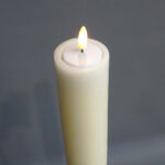 We kunnen een (huis)paaskaars met bijenwas geschikt maken voor LED-uitvoering. We verwijderen dan bovenaan het lont en maken een “kom” op de maat van een theelicht (max. diameter 4 cm.). Daarin kan een LED-theelicht geplaatst worden en voila, we hebben een kaars welke gebruikt kan worden in elke ruimte waar geen open vuur toegestaan is. Dus kerken, kapellen, verzorgingshuizen, bejaardenhuizen, ziekenhuizen etc.